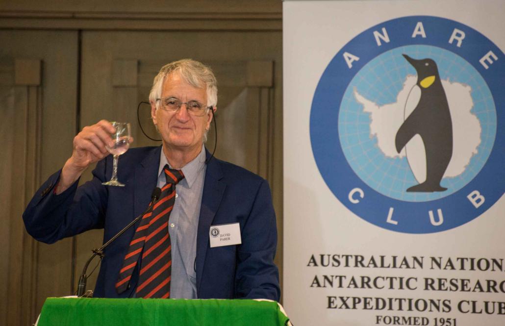 Gary Abbotsmith presenting his father, John Abbotsmith's ANARE pennant to the ANARE Club
