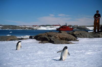 We got underway at 04:30 hours (no idea how I managed to be up that early), steaming to within 30nm north of Polar Bird by 08:00 hours, in 10/10 close pack, 1.5m with soft snow. Whilst writing up my journal back in my cabin, my cabin mate Sarah brought to my attention about 25 Adelies who were bravely making their way some distance over to the stationary ship. We had a wonderful view through the port hole, as 5 or 6 exceptionally brave fellows wandered, strutted and slid on stomachs right up to the ship, practically below our porthole.