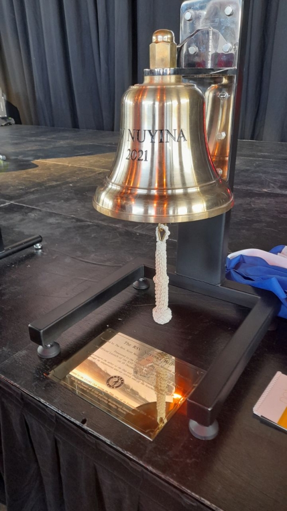 A tribute to the makers of the Bell, Peter and Robert Olds of Maryborough, Queensland and to the engraver, Brendan Currie, of National Engraving, Bendigo, Victoria, are engraved on a Brass plaque recording the event, to be placed under the Bell following its installation on the Bridge of the Nuyina.